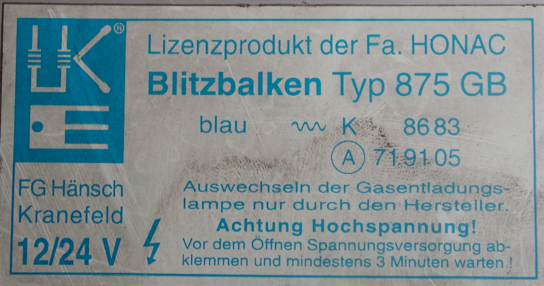 Blitzbalken Typ 875 GB Der Kenner sieht es sofort und das Typenschild (Bild 2) sowie die Haubenaufschriften verraten es dann deutlich: der Balken ist eigentlich ein Whelen Edge 9000, Lieferant für Hänsch ist die niederländische Firma Honac. -Bild 1-